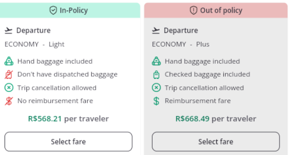 The indexes can reflect rules regarding price, advance notice, or number of days. If the indicator appears green , it means the result is within the company's travel policy.